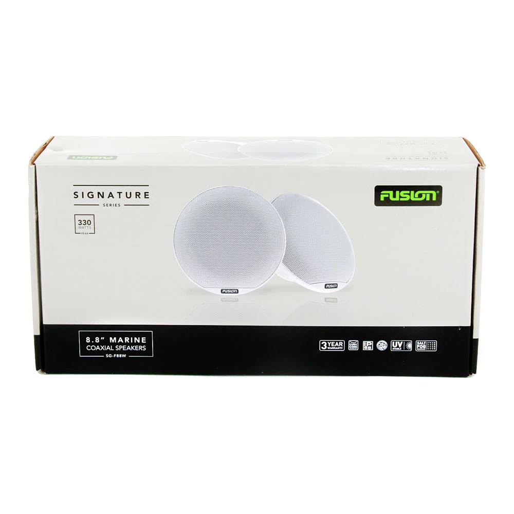 Pump up the volume and get the party started! The Fusion Signature 2-Way Coaxial Marine Speakers are designed to provide unparalleled performance even when exposed to the harshest marine conditions. Combining ‘CURV’ Cone composite technology with a Silk Dome tweeter and fully sealed crossover IP65 waterproof components, the Classic White Signature 8.8″ speaker system is an elegant solution for premium on-water listening.